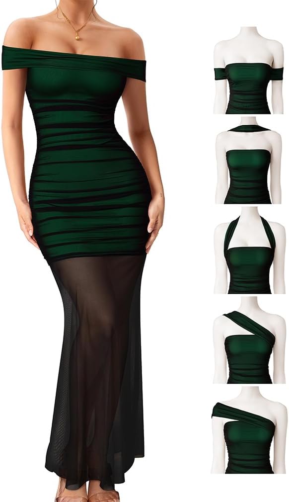 LAGSHIAN Women's Sexy Maxi Dress Off Shoulder Sleeveless Ruched Bodycon Mesh Evening Long Dresses