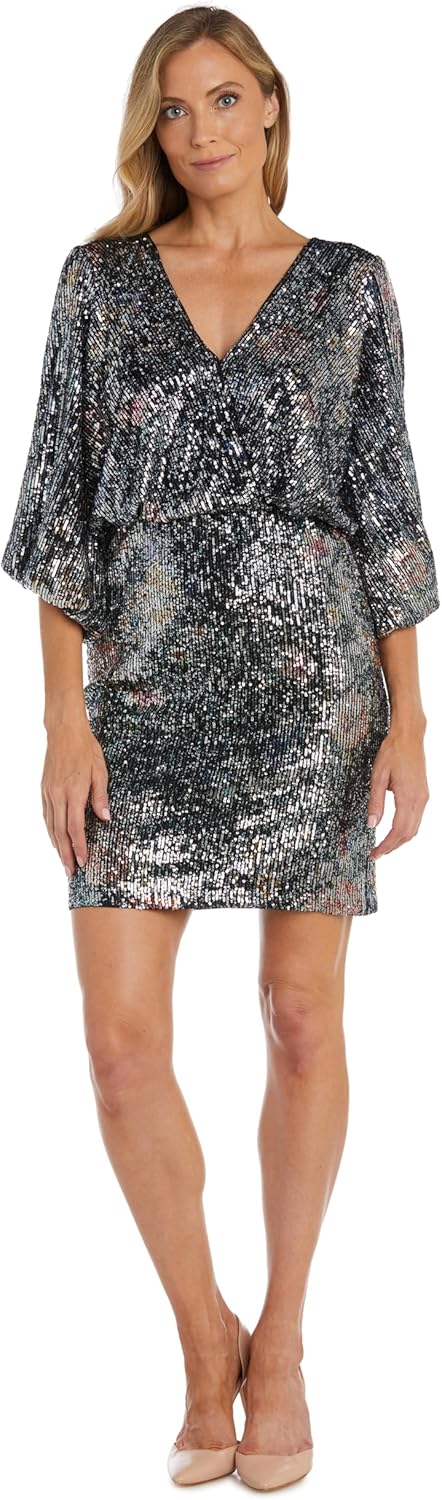 R&M Richards Elegant Beaded Blouson Wrap Dress W/Dolman Sleeves & Sequin Print - Black Multi, Knee-Length