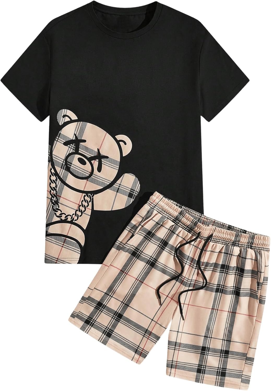Men's Casual Outfits Short Sleeve Cartoon Bear T Shirt and Drawstring Plaid Shorts Tracksuits Set
