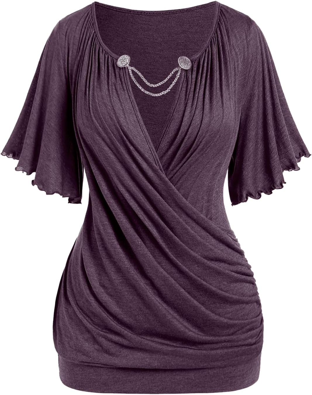 ROSE GAL Plus Size Lettuce Ruched Chain Embellished Plunging Blouson Tee