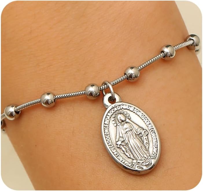 Gold Virgin Mary Charm Bracelet,Stainless Steel Ball Chain Bracelet for Women,Cross Adjustable Bracelets Baptism Faith Jewelry Gift