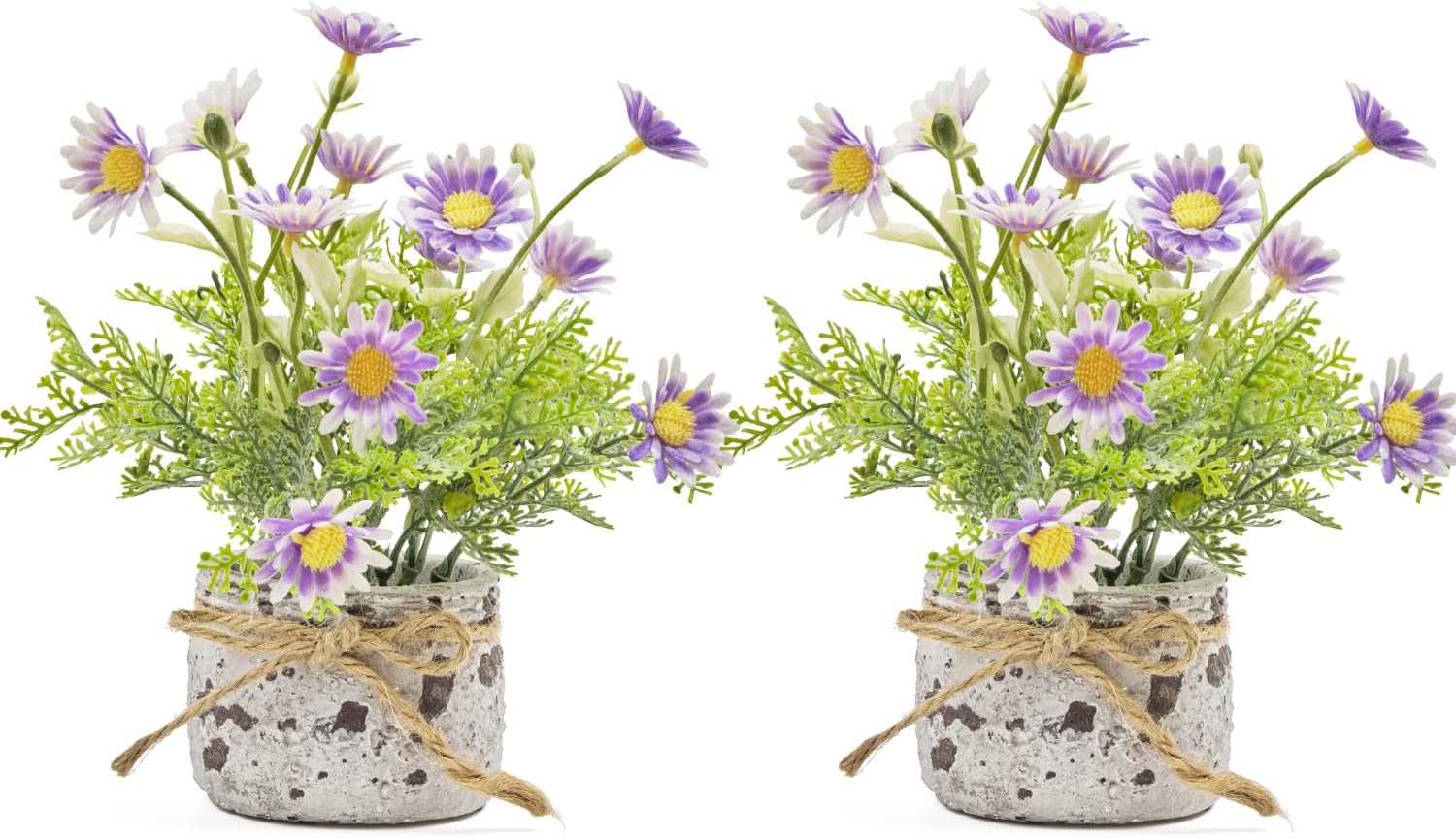 - 【Real Touch Flowers Bouquet in Flower Pot】The faux flowers in a hemp rope cement pot comes in a set of 2 where each pot measure 4 x 4 x 5 inches. The fake daisy flowers come in purple. Made from high-quality plastic, the small fake flowers offer nearly natural looking petals and foliage textures, that add a soft, soothing and realistic blooming vibe to your decor. They are hassle-free to maintain and can be cleaned with just a damp cloth.