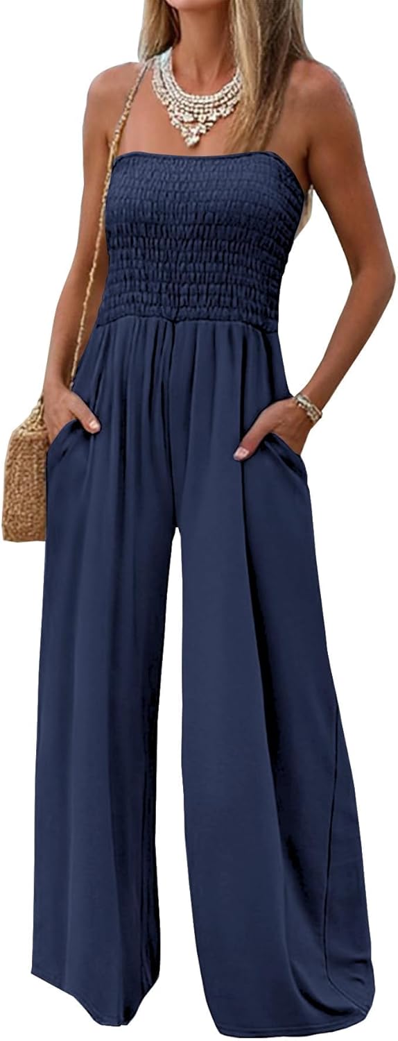 AUXDIO Womens Casual Strapless Summer Jumpsuits Loose Off Shoulder Smocked Sleeveless Wide Leg Romper with Pockets