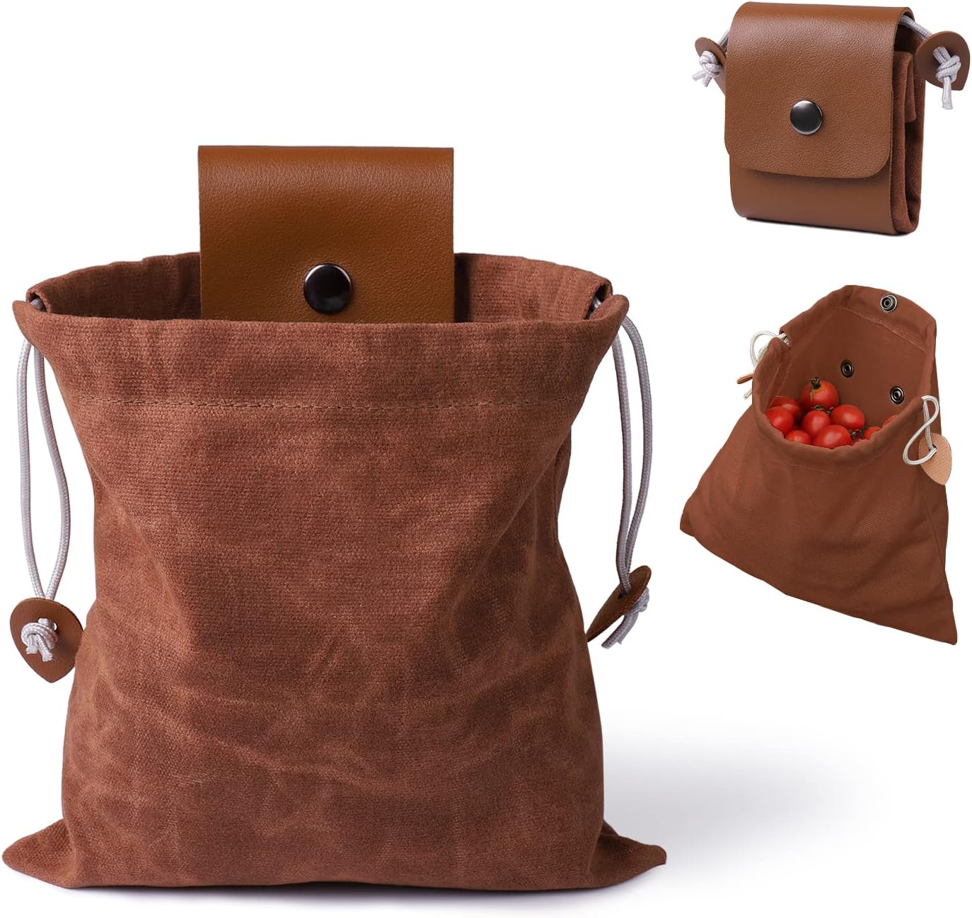 - 💼EASY TO CARRY AND USE: Waxed canvas foraging pouch are foldable to save space. They can be placed on the belt when not in use, freeing your hands.The foraging bag with a simple buckle, The canvas bag can be unfolded with one hand. When the bag is full, you can also tighten the bag opening with a drawstring to prevent items from spilling.