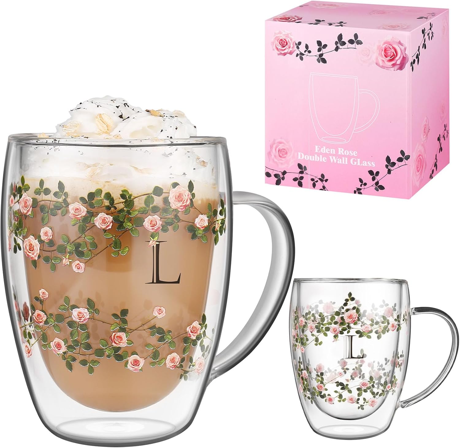 Initial Glass Cup for Women, 12oz Rose Double Walled Glass Coffee Mugs, Personalized Gifts for Women, Initial Coffee Tea Mug with Scarf, Birthday Wedding Gifts for Her Mom Teacher (ROSE-L)