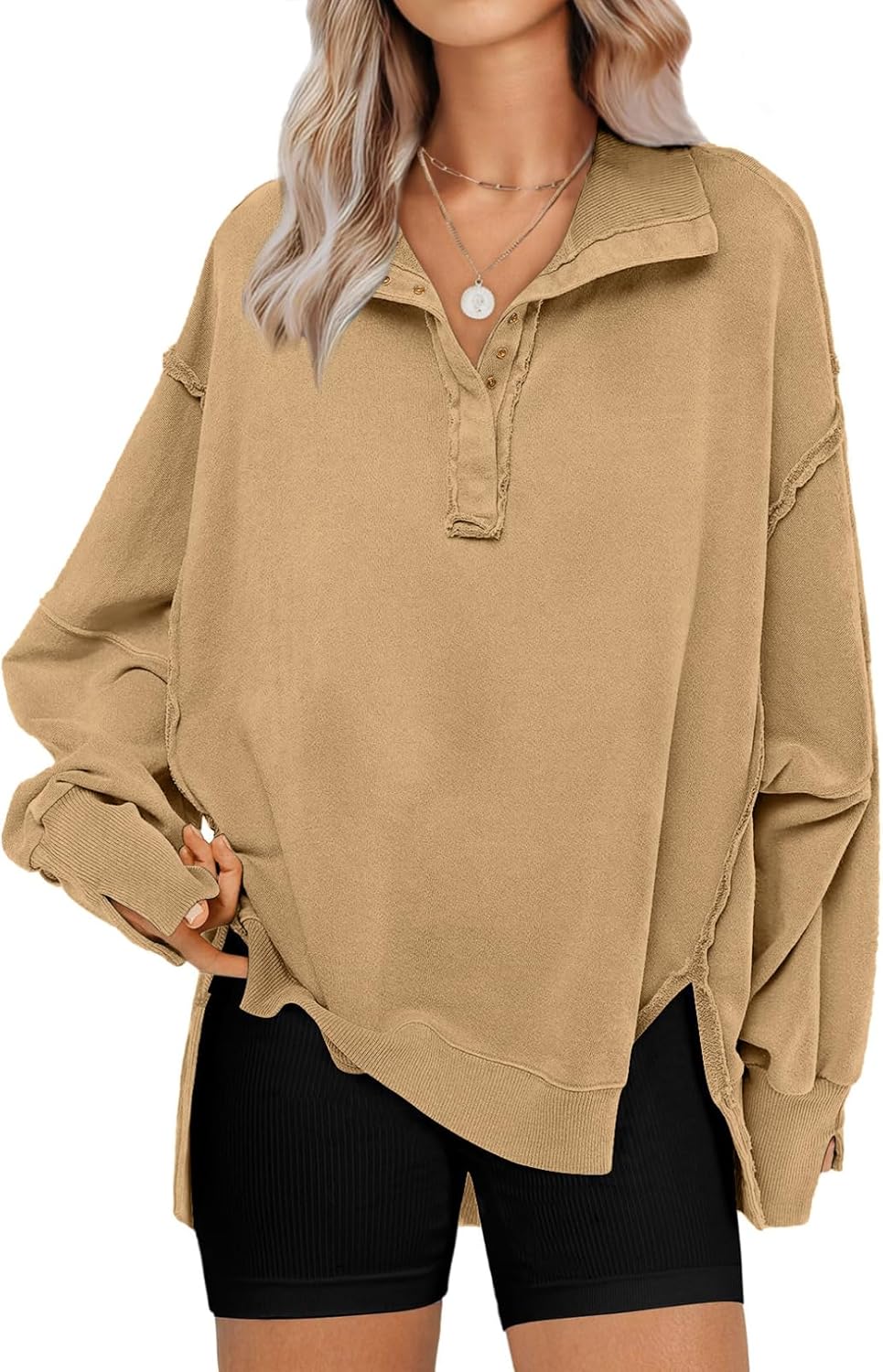 SHEWIN Womens Reverse Seam Snap-Button Henley Sweatshirt Casual Loose High Low Split Pullover Tops
