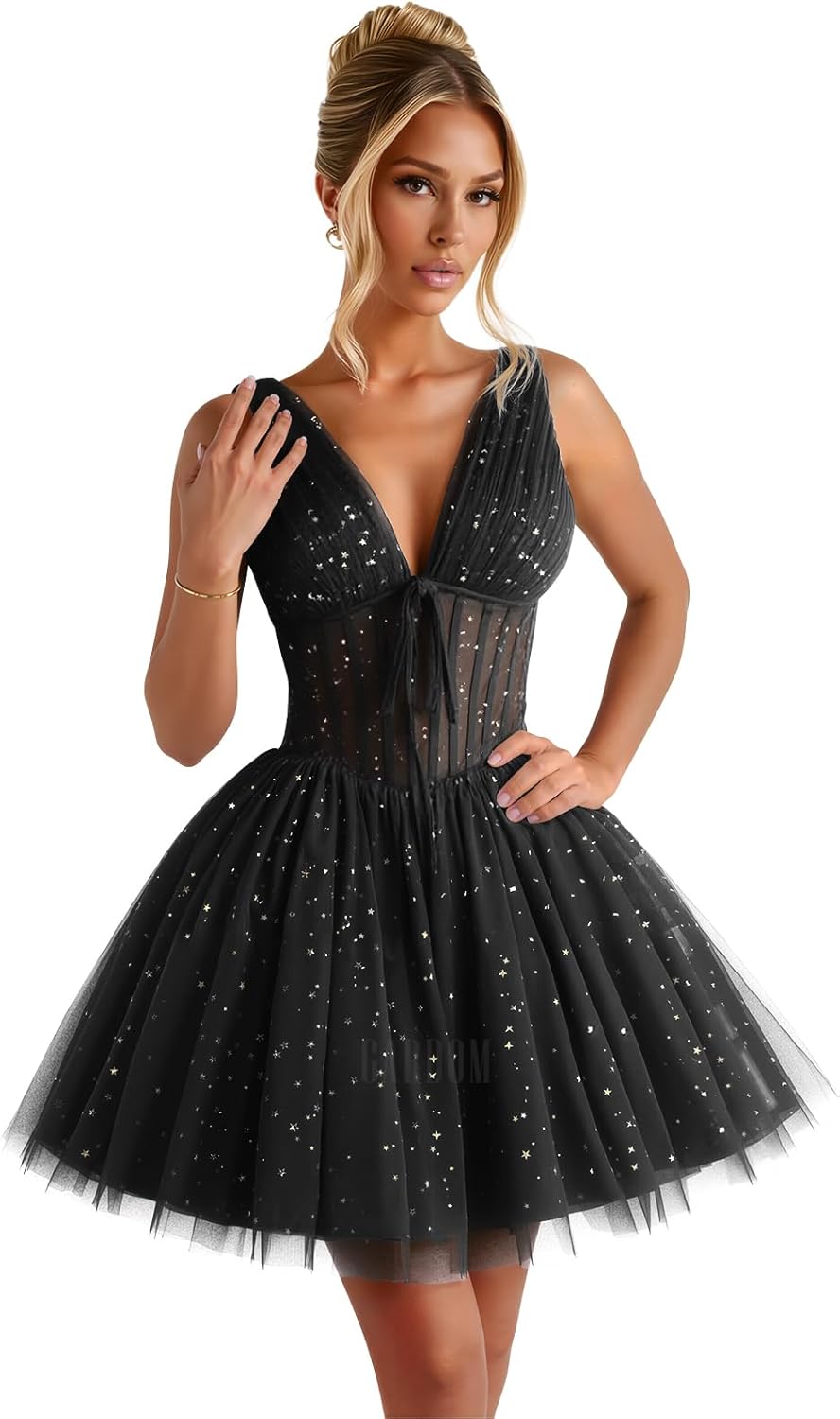 GARDOM Sparkly Starry Tulle Homecoming Dresses Short for Teens V Neck Prom Dresses Star Moon Cocktail Dress Mini Gowns