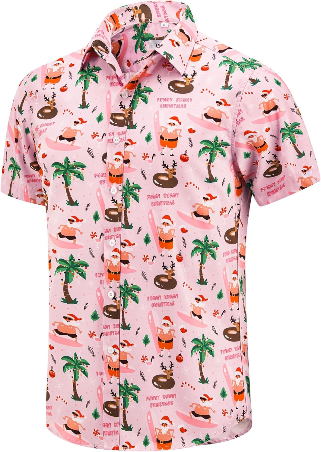Christmas Hawaiian Button Down Shirt for Men Xmas Santa Printed Casual Beach Short Sleeve Shirts