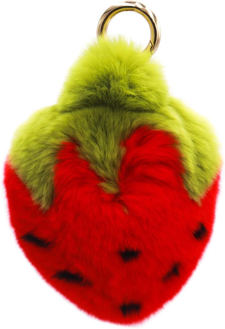 surell Real Rex Rabbit Fur Strawberry Keychain - Kawaii Pom-Pom Food Charm for Bags - Fruit Accessory with Gold Keyring