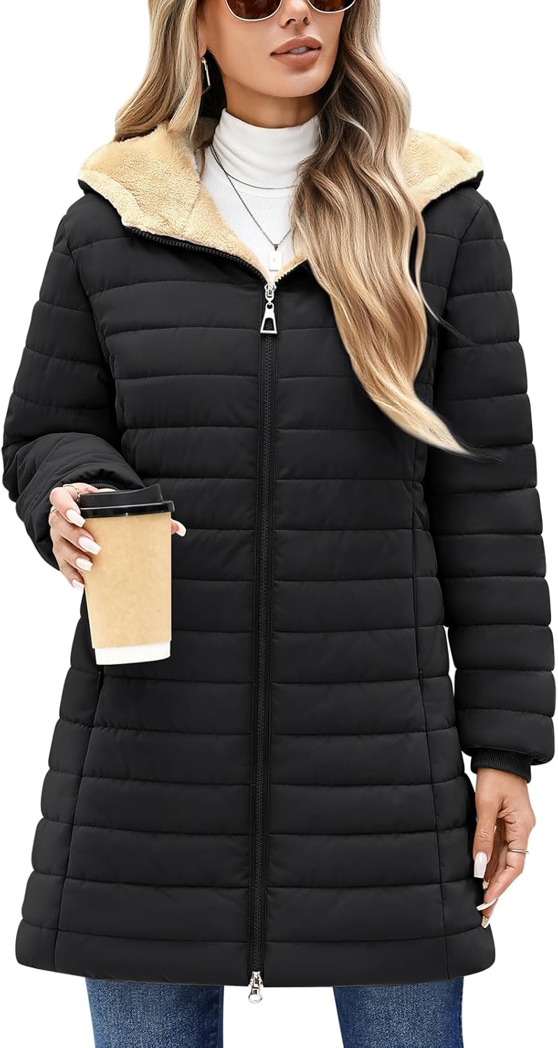 Women's Puffer Jacket with Hood, Lightweight Winter Quilted Jacket Outwear Down Coat Long Sleeve with Fleece Lining