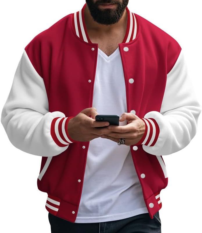 Men's Varsity Baseball Jacket Classic College Style Bomber Coat with Striped Ribbed Collar Casual Outerwear