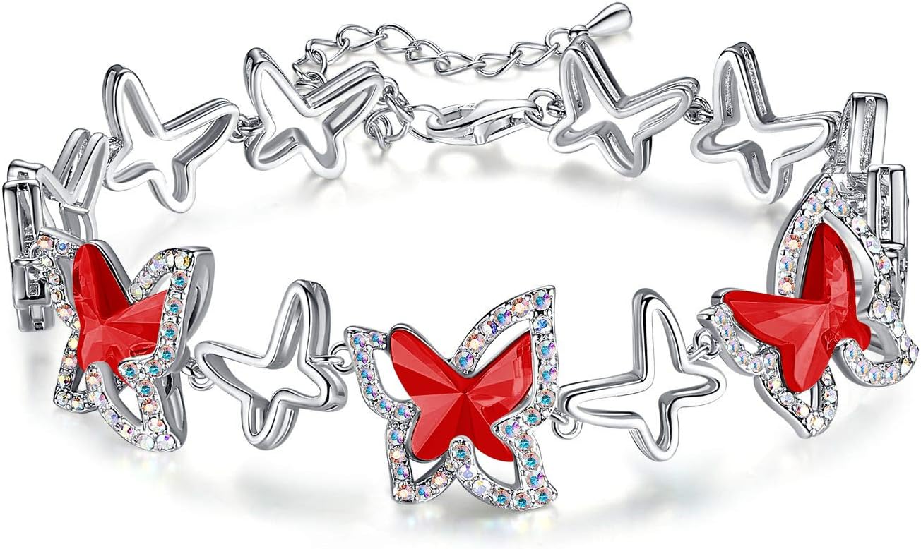 Valentine's Day Gift For Women Butterfly Link Charm Bracelet with Premium Birthstone Crystal, Silver-Tone, 7”+2” Chain