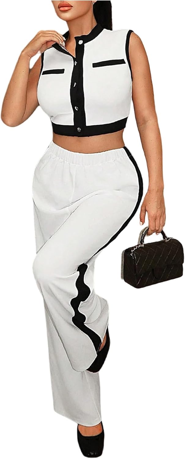 Verdusa Women's 2 Piece Business Casual Outfits Button Up Contrast Trim Crop Tank Top with Pants Comfy Sets