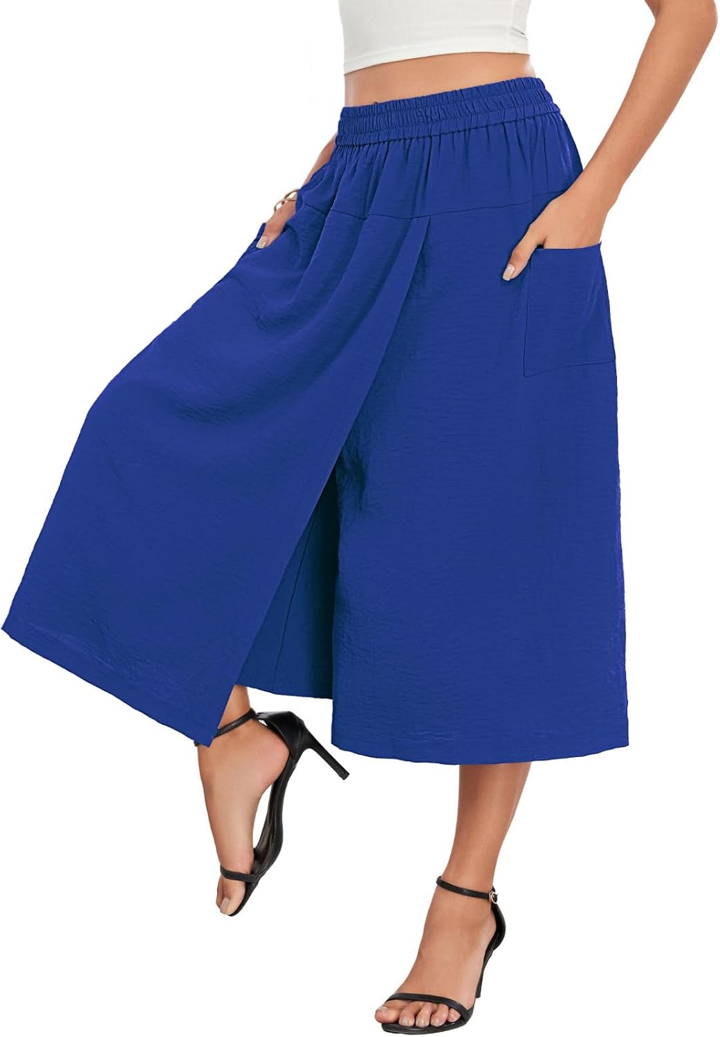 Women's High-Waisted Relaxed Fit Capri Culottes Flowy Palazzo Pants with Practical Pockets Skirt Pant, Royal Blue, 2XL