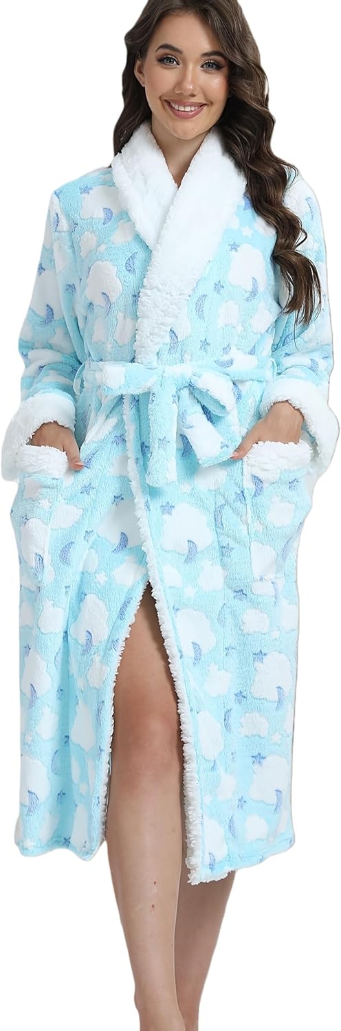 Women's Robe with Faux Fur Trim Long Loungewear Gown, Soft 100% Polyester with Pockets and Belt for Spa and Home