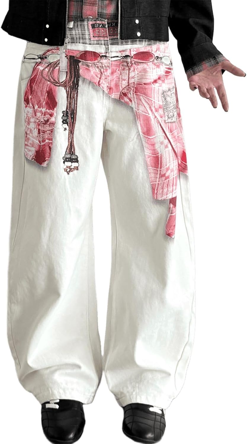 Women's High Waisted Baggy Jeans Vintage Casual White Wide Leg Trousers Ethnic Print Patchwork Distressed Pants