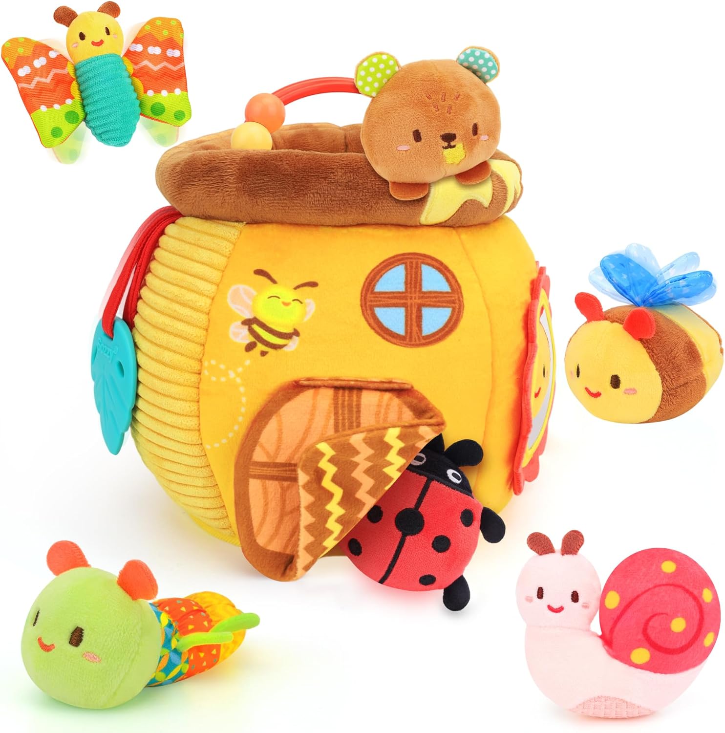 Baby Toys 6-12 Months - Soft Honey Jar with 6 Sensory Insect Stuffed Animals Montessori Plush Toys W/Rattle, Crinkle Paper, Mirror for Toddlers 1 2 3 Year Motor Skills Developmental