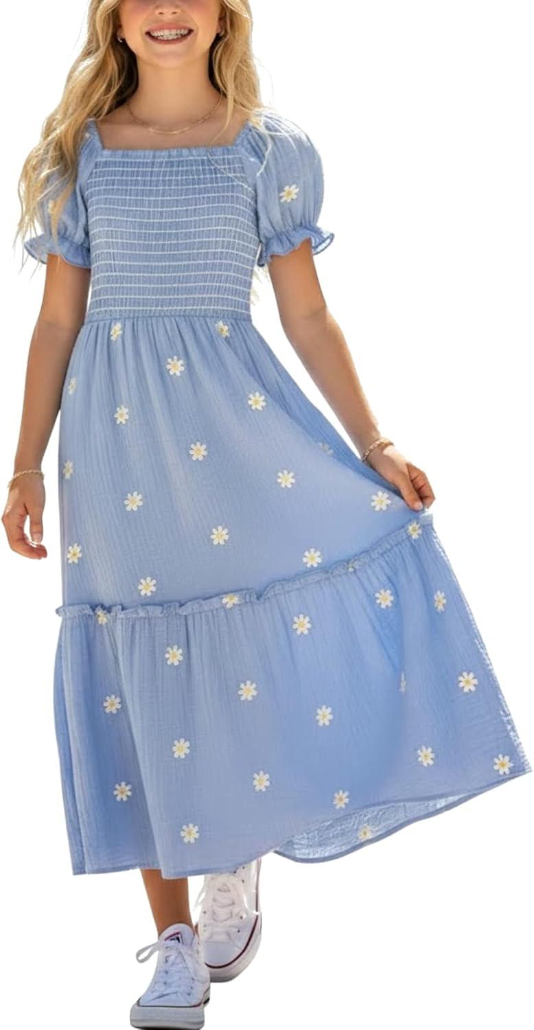 Sunny Spirit Girls Maxi Dress Tween Dresses for Girl Spring Summer Boho Floral Short Puff Sleeve Smocked Cotton 5-14 Years