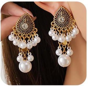 Missgrace Boho Indian Gold Plated Rhinestone Faux Pearls Dangle Teardrop Long Earrings for Women Vintage Retro Chandelier Earrings Beaded Crystal Jhumka Jhumki Tassel Studs Traditional Green Red Earrings for Women