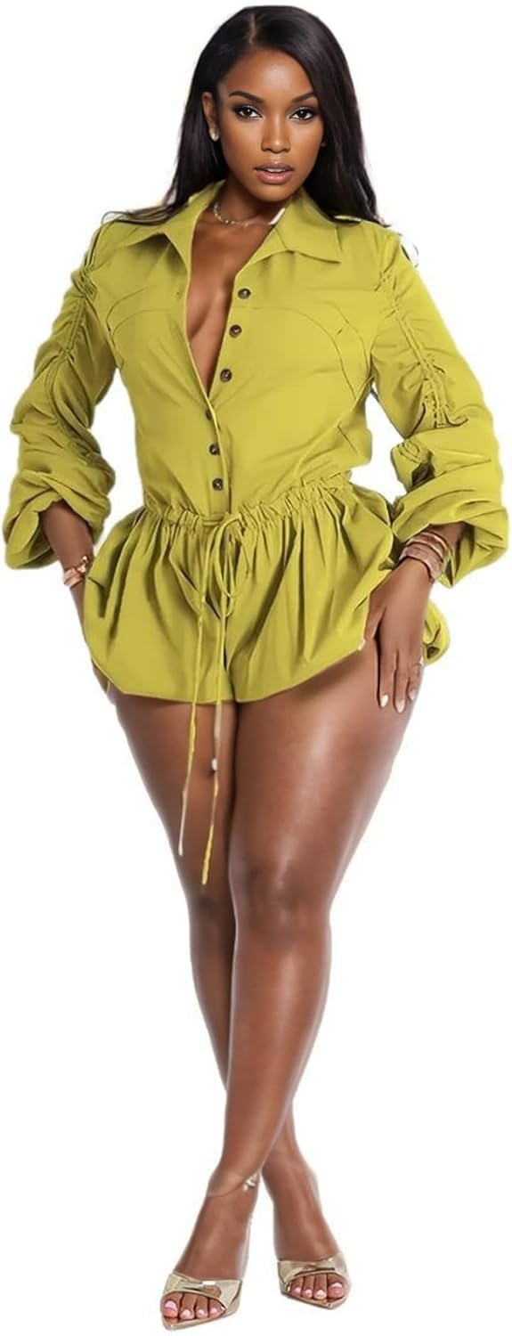 Famnbro Womens Summer Rompers Long Sleeve V Neck Drawstring Bubble Short Cute Jumpsuit One Piece Club Outfits