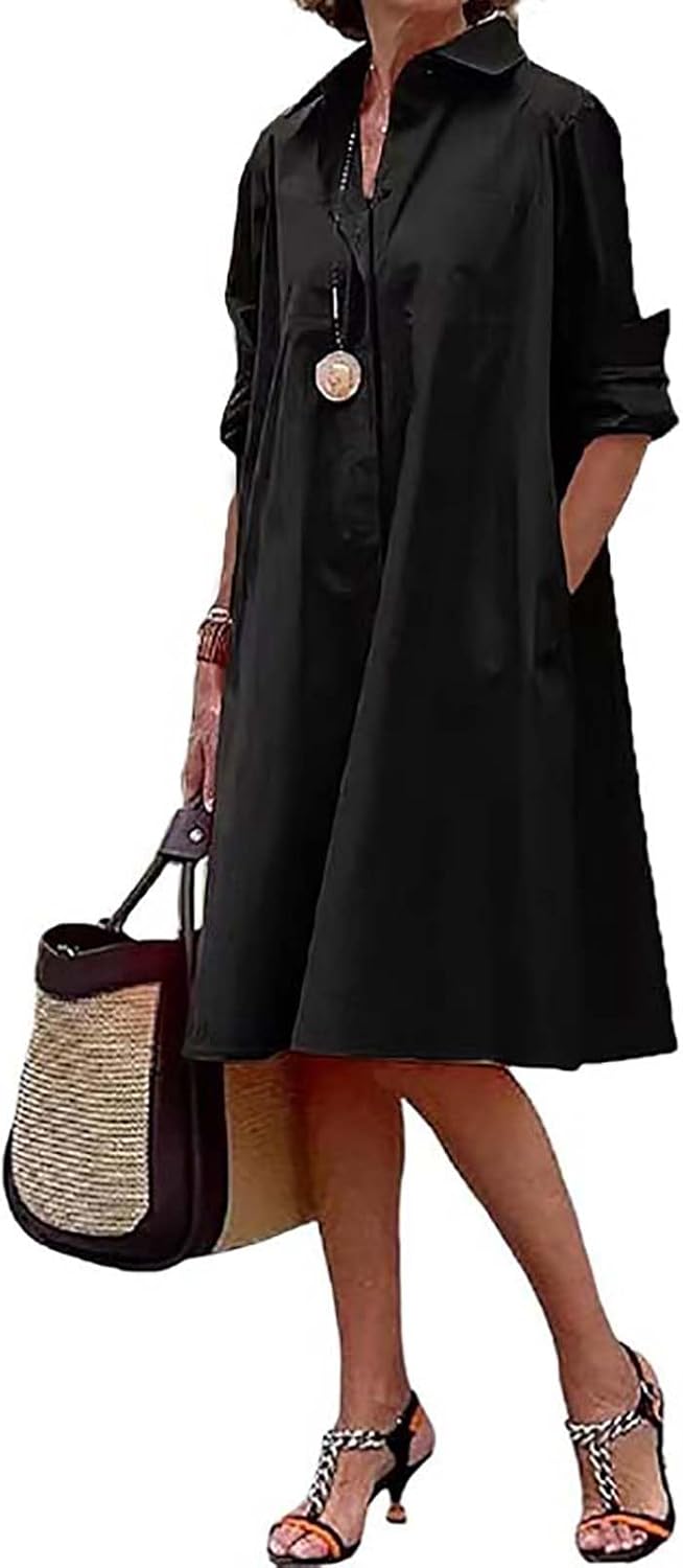 BDAILKA Women's Shirt Dress Casual Midi Dress Button Down V Neck Fit A-Line Shirt Dresses