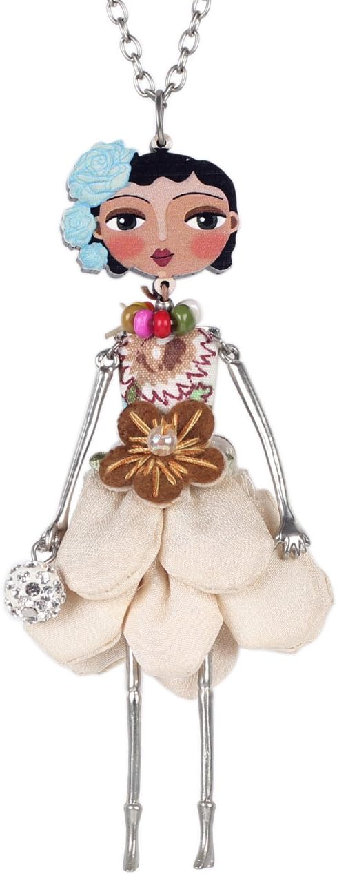 BONSNY Handmade Floral Paris Doll Necklace, Fabric Dress with Flower Pattern, Silver Chain, Fashion Statement Pendant Jewelry