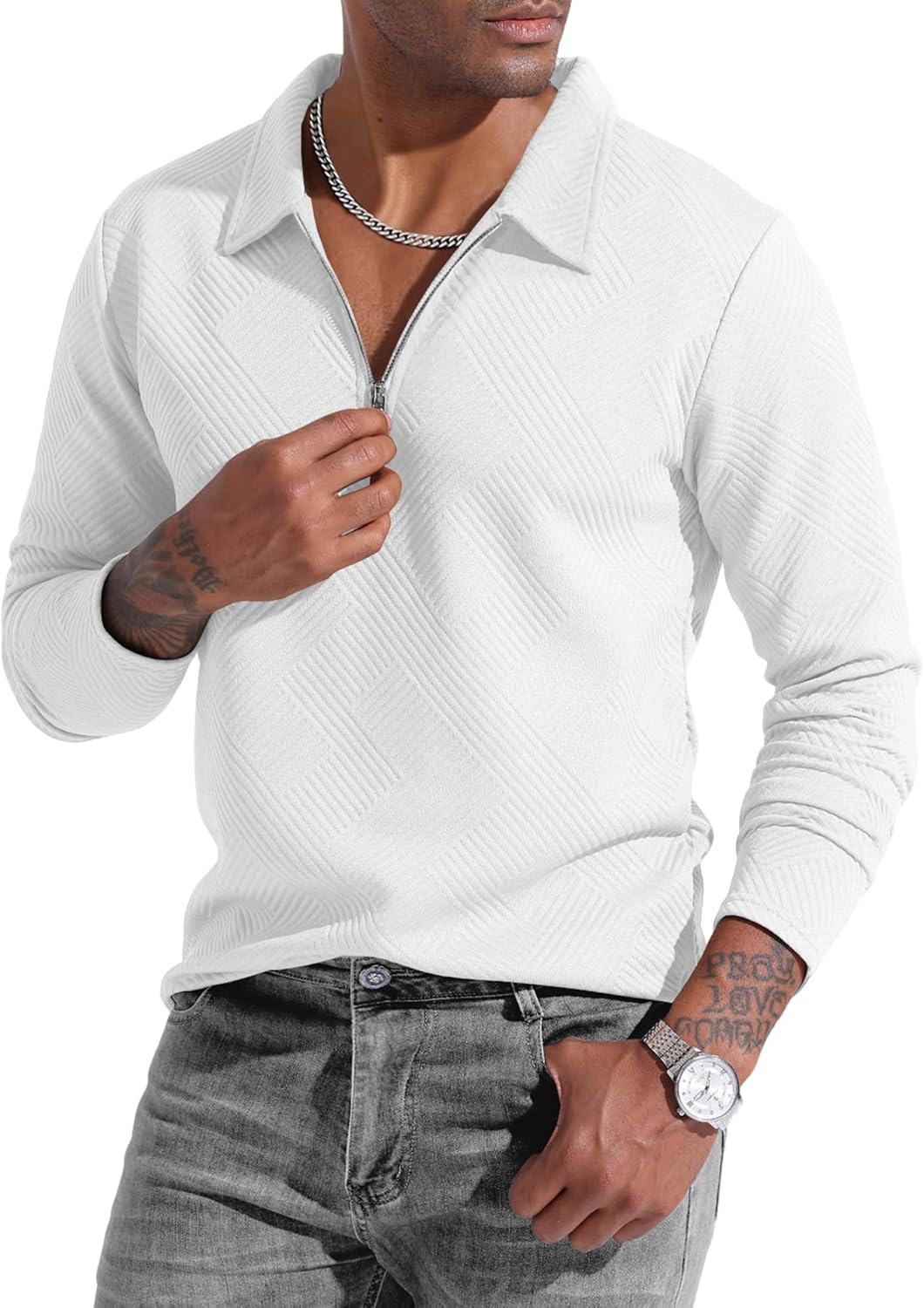 UOUA Men's Polo Shirt Quarter Zip Tops Soild Casual Geometric Texture Long Sleeve Sweaters Pullover Golf Sweatshirts