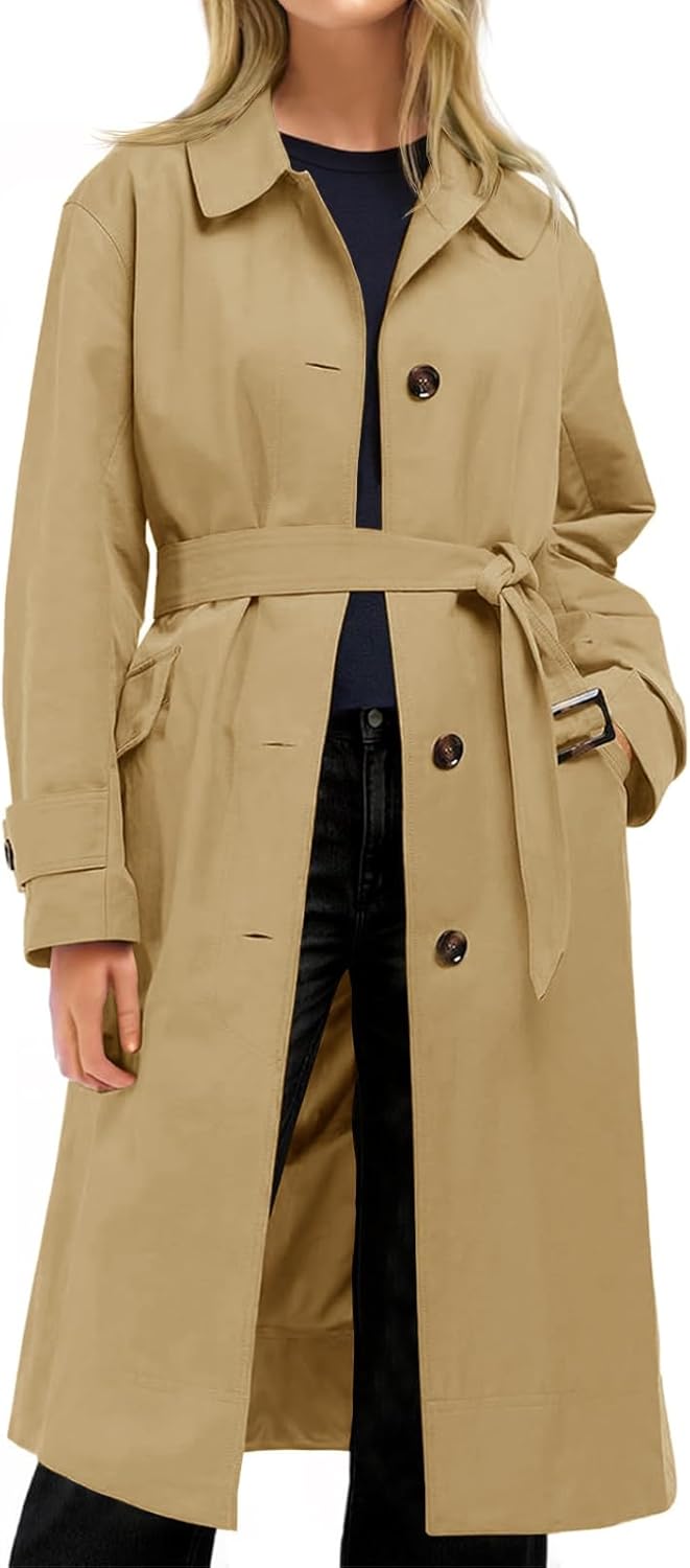 Tankaneo Womens Trench Coats Single Breasted Long Windproof Overcoat with Pockets and Belt