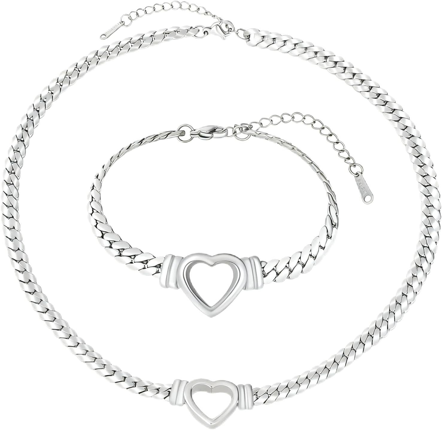 Chunky Flat Curb Chain Necklace and Bracelet Set, Gold/Silvery Stainless Steel Hollow Heart Pendant Jewelry for Women, Valentines Wedding Gift