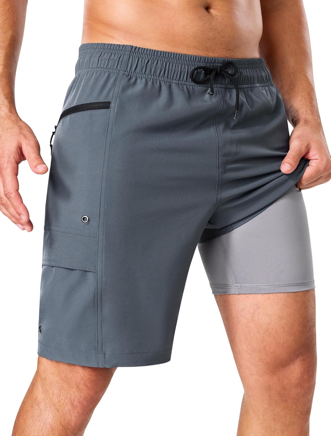 SILKWORLD Mens Swim Trunks with Compression Liner Quick Dry Bathing Suit 9" Swimming Beach Shorts with Zipper Pockets