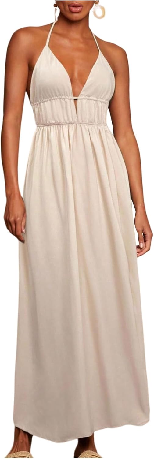 SweatyRocks Women's Tie Backless Summer Halter Dress Deep V Neck High Split Maxi Flowy Dresses