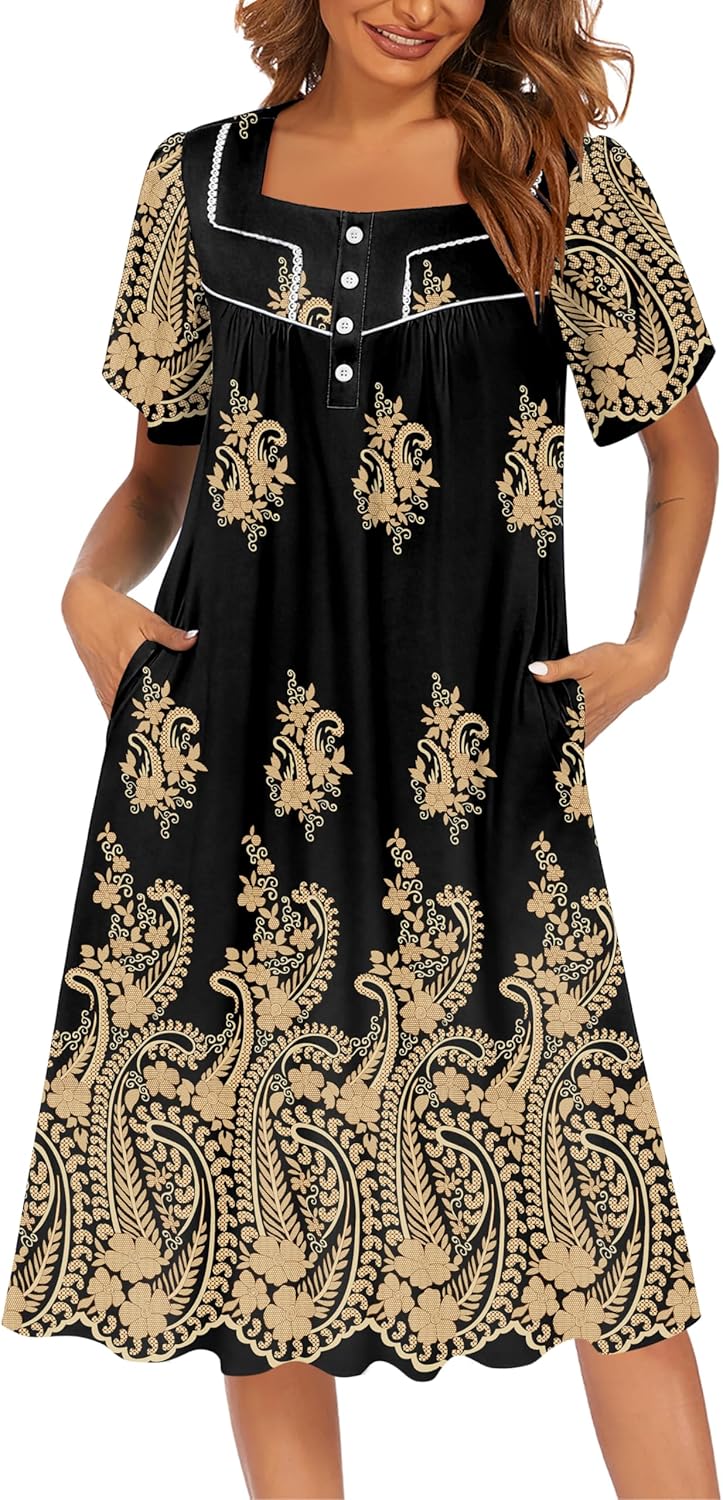 Ekouaer Women's House Dress with Pockets Moomoo Dresses Short Sleeve Mumu Nightgown Lounge Dress Button Down Sleepwear