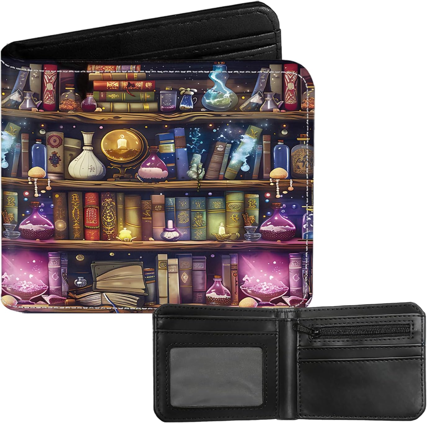 - Product Design: This bookshelf patterned bi-fold wallet is crafted from premium PU leather. Its smooth bi-fold design combines modern elegance with everyday practicality. Available in a variety of artistic patterns and classic solid colors, it caters to both casual and sophisticated styles, making it a versatile accessory for any occasion and outfit.