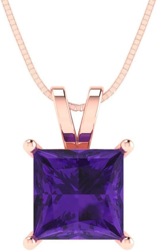 Clara Pucci 14K Rose Gold Plated Solitaire 16" Box-Chain Necklace - Sterling Silver 2ct Princess Cut Amethyst Pendant