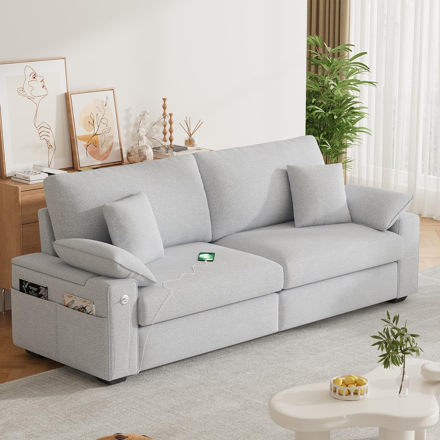89" Modern Sofas for Living Room, Comfy Sofa with Deep Seat Couch, USB/Type-C Port, Side Storage, Removable Cover, Couches for Living Room, Apartment, Light Grey