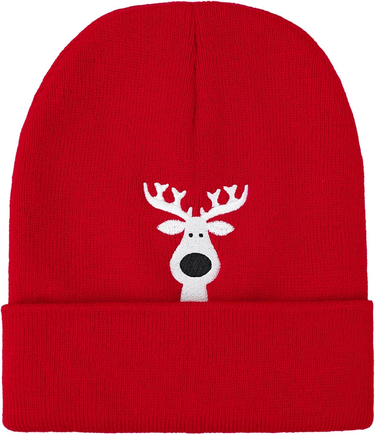 Christmas Beanie Hat Red Knit Skull Cap with White Reindeer Embroidery, Warm Winter Hat Gift for Men Women