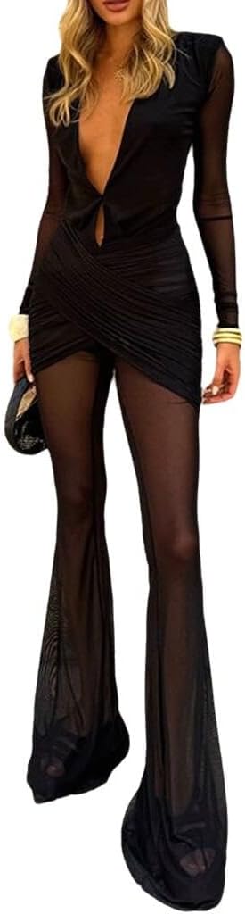 Wuitrie Sexy Jumpsuits for Women See Through Mesh Deep V Neck Flare Ruched One Piece Jumpsuit Elegant Club Date Night Outfits