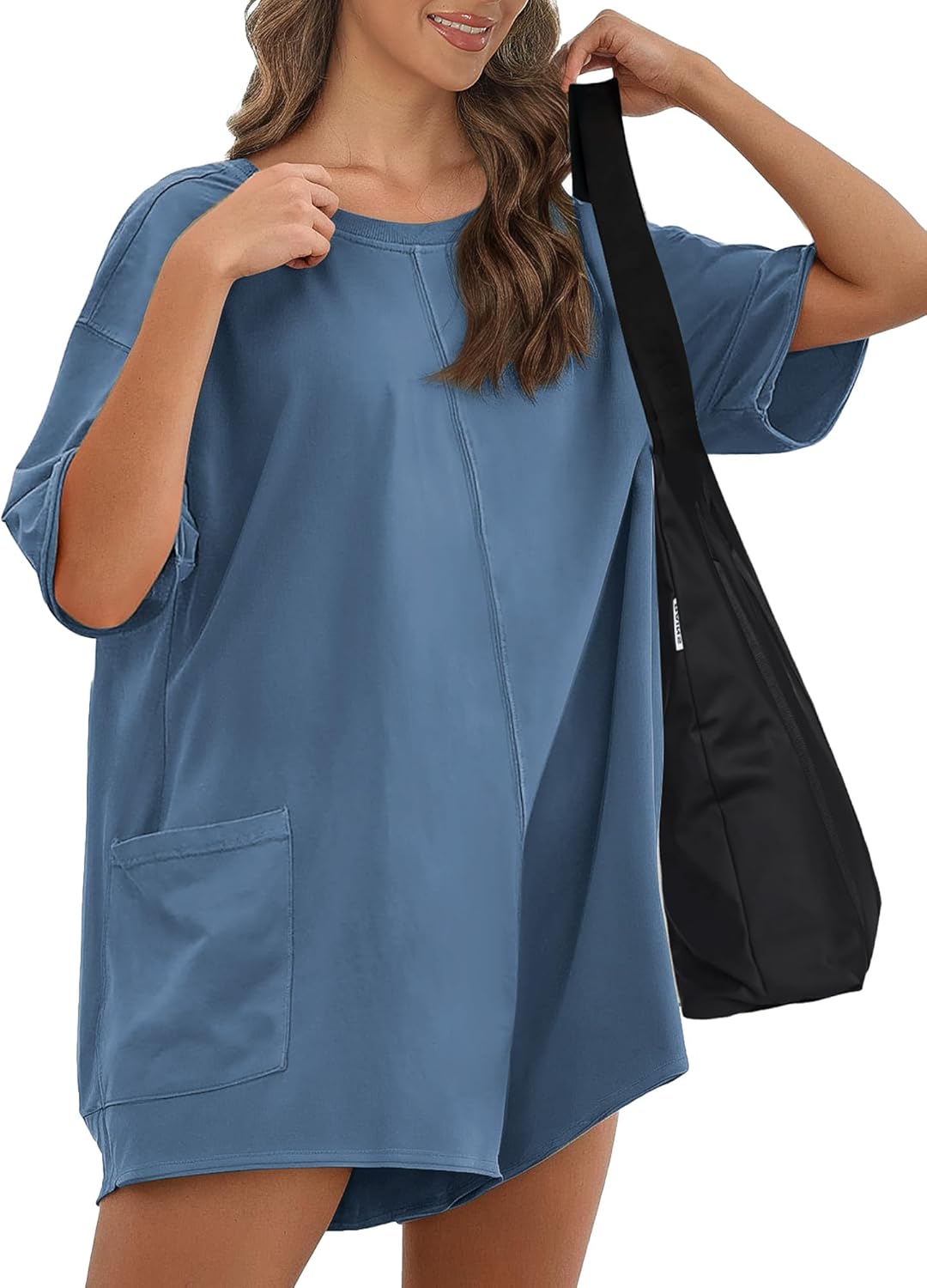 Buauty Women Summer Oversized Jumpsuit Romper,Athletic Workout Short Sleeve Overalls,Trendy Casual Baggy Tee Outfits