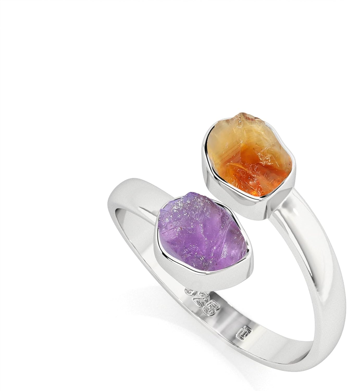 Natural Raw/Rough Amethyst & Citrine 2 Stone Size Adjustable Stackable Twister Ring for Women in Sterling Silver, February & November Birthstone Jewelry Gifts for Her (Bezel-Set)