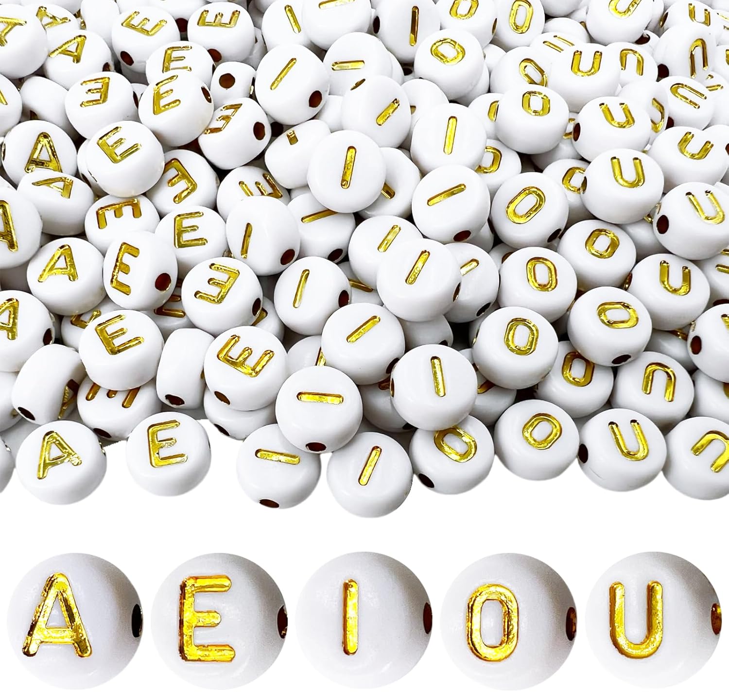 MIIIM 1000pcs Vowel Pony Letter Beads for Keychains Making (A, E, I, O, U), 4x7mm Round Letter Beads for Bracelets Making, Alphabets, Numbers (White and Golden)