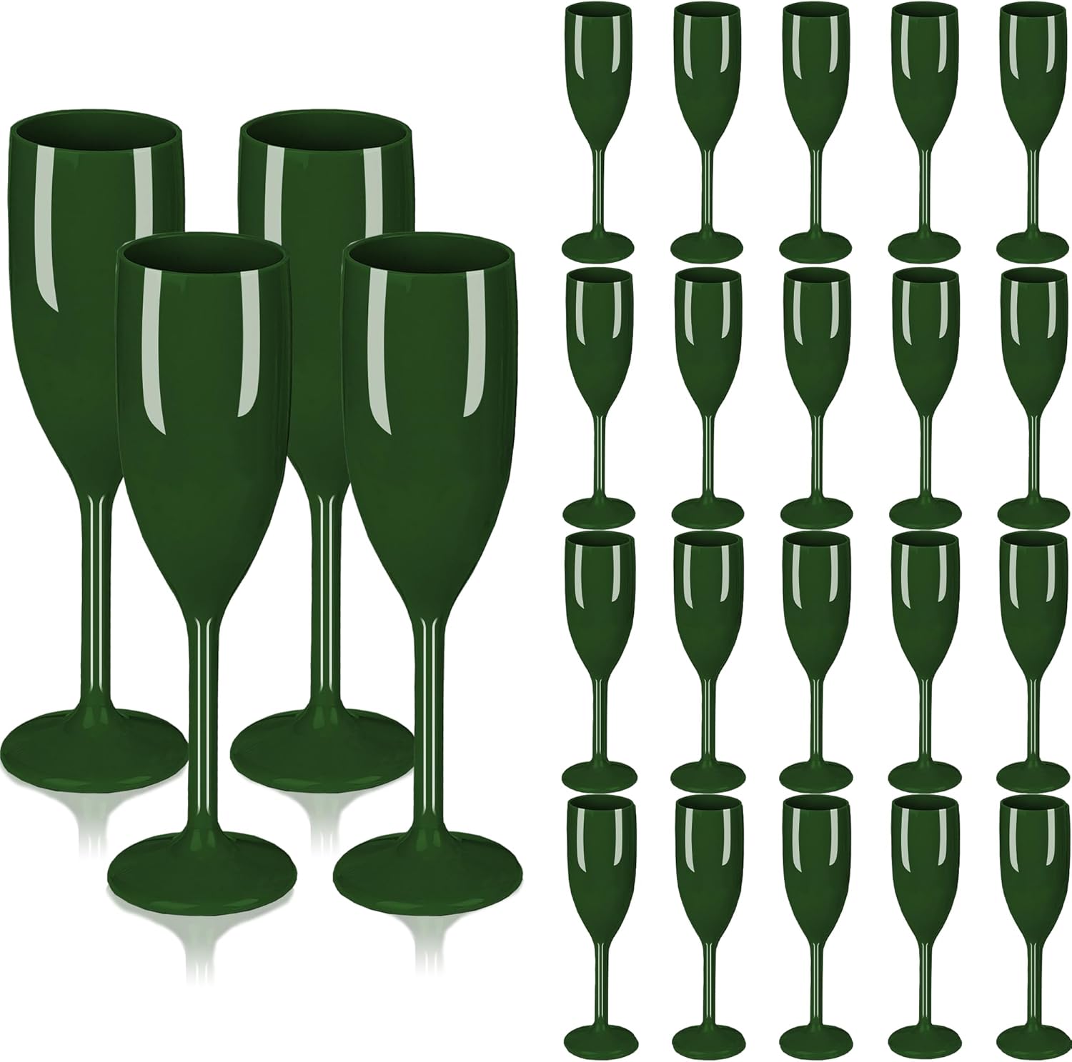 - Charming Set: Champagne flutes set include 24 dark green champagne plastic wine glasses, providing ample quantity to meet your daily use and replacement needs. A suitable champagne cup is the icing on the cake. Plastic wine glasses not only carry the wine, but also carries the laughter and blessings