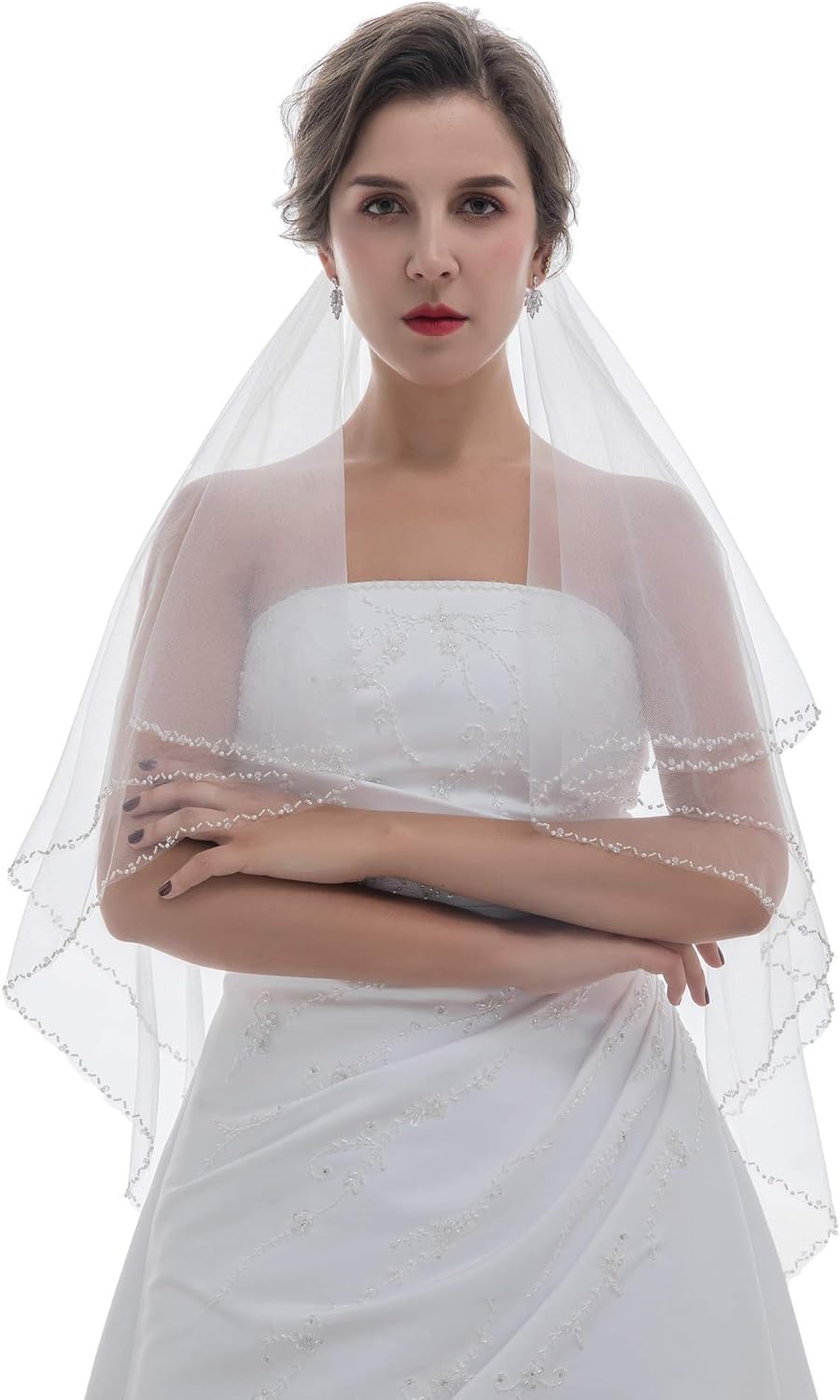 SAMKY 2T 2 Tier Pearls Crystals Wavy Beaded Veil - Light Ivory Fingertip Length 36" V381