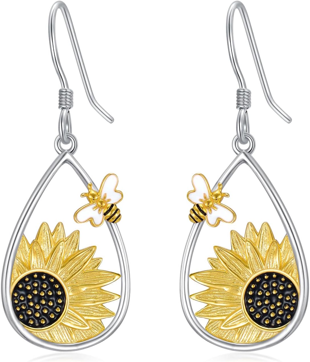 RMREWY Bee Sunflower Teardrop Dangle Earrings 925 Sterling Silver Boho Bohemian Hook Earrings for Women Mothers Day Jewelry Gifts