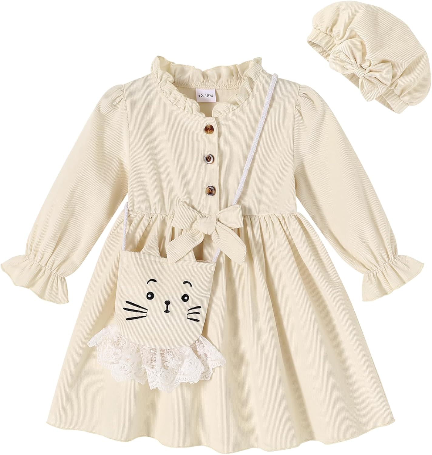 Happy Town Toddler Fall Dress Baby Girls Long Sleeve Bowknot Dresses Kids Winter Casual Outfits with Hat and Bag
