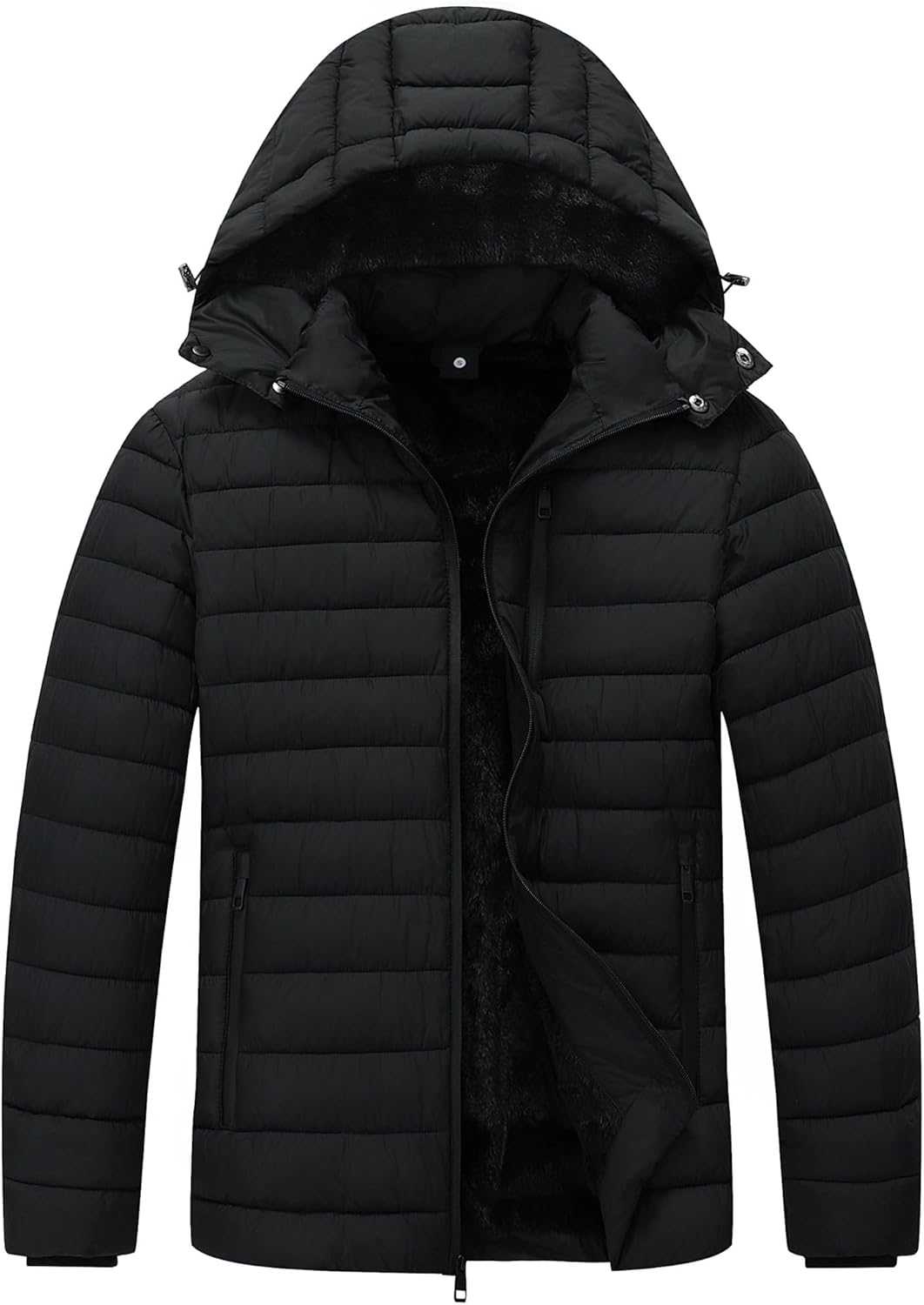 Men's Quilted Puffer Down Coat| Windproof, Waterproof, Flannel Lined, Detachable Hood, Thicken for Winter Warmth