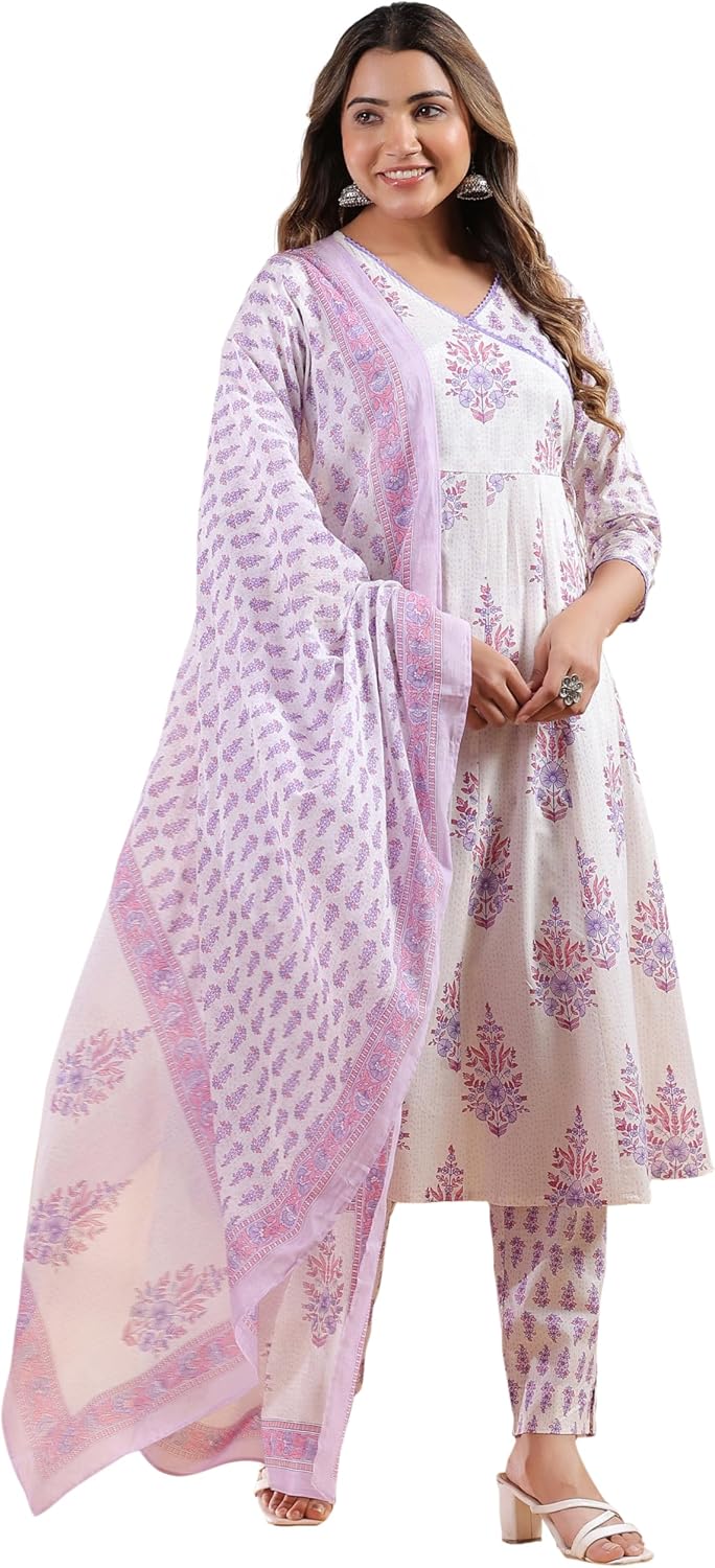 Janasya Indian Women's Cotton White Floral Print Casual Wear Kurta Set for Women