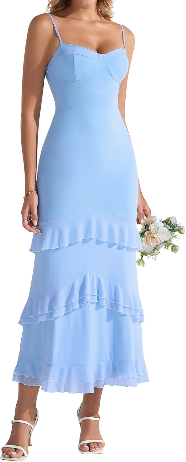 XinFSh Women Ruffle Bodycon Maxi Dress Spaghetti Strap Long Formal Wedding Guest Cocktail Party Dresses