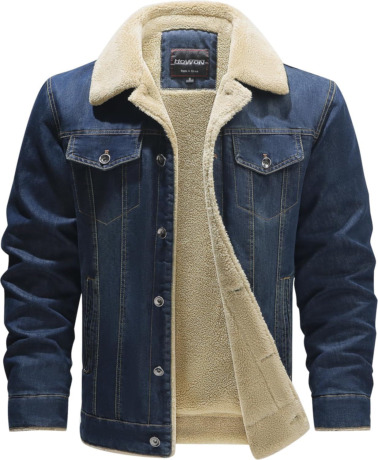 HOW'ON Men's Plus Cotton Warm Fur Collar Sherpa Lined Denim Jacket Button Down Classy Casual Quilted Jeans Coats Outwear