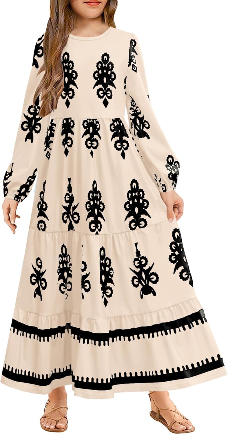 HOSIKA Girls Fall Maxi Dress Long Sleeve Boho Floral Tiered Ruffle A-Line Casual Holiday Dresses with Pockets for 6-12 Y