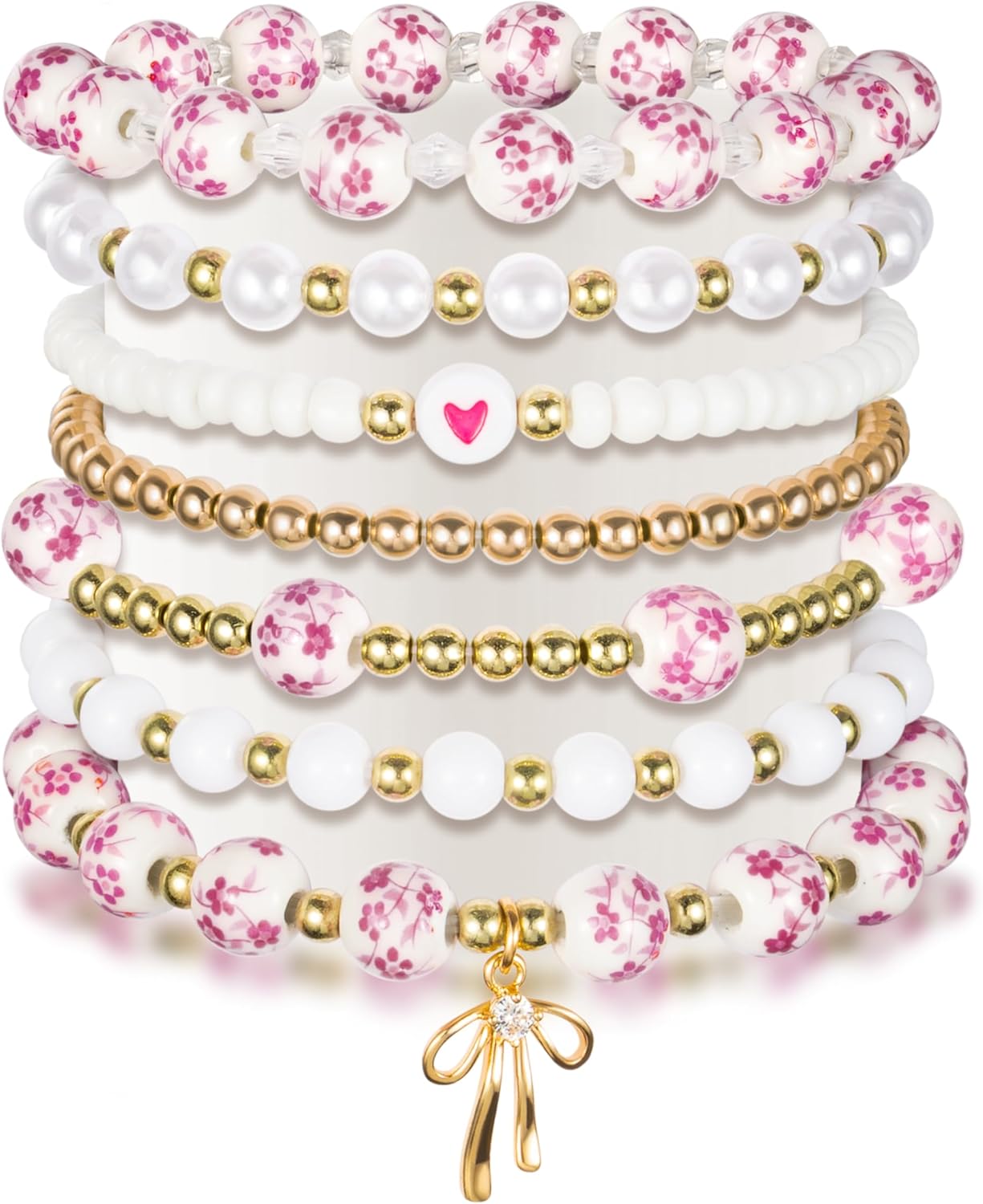 Y1tvei Vintage Ceramic Bead Bracelets - 7Pcs Coquette Wrist Bracelet Stretchable Chain Gift Supplies for Women